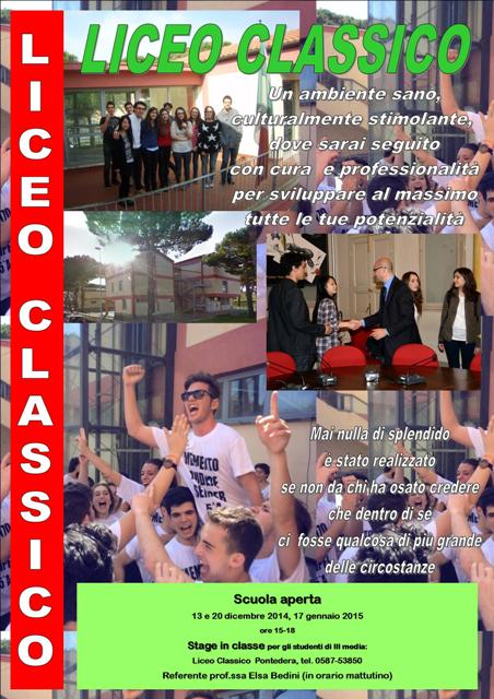 Liceo Classico Scuola Aperta 13 e 20 dicembre 2014, 17 gennaio 2015, ore 15-18, Stage in classe per gli studenti di III media: Liceo Classico Pontedera, tel. 0587-53850, referente prof.essa Elsa Bedini (in orario mattutino)